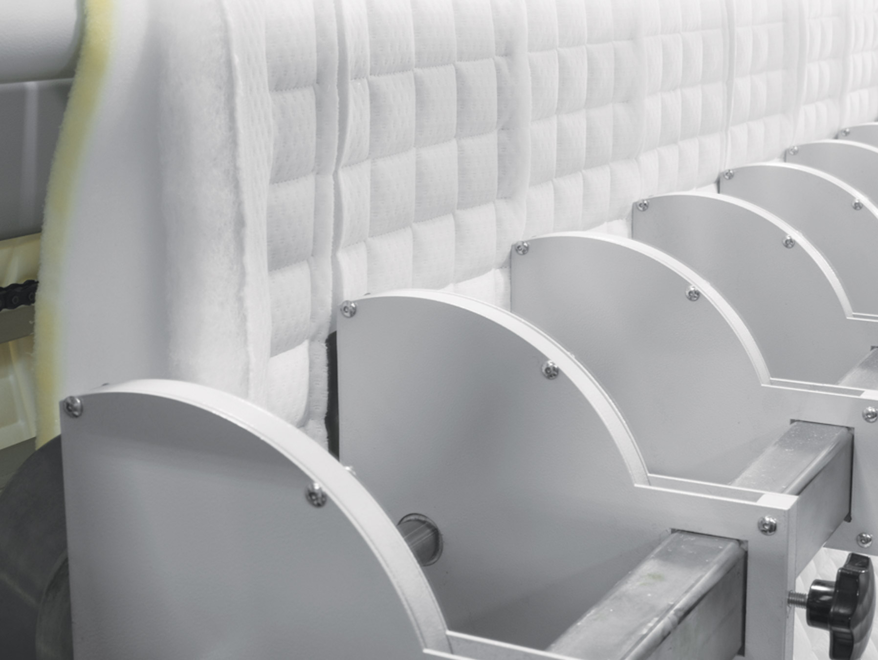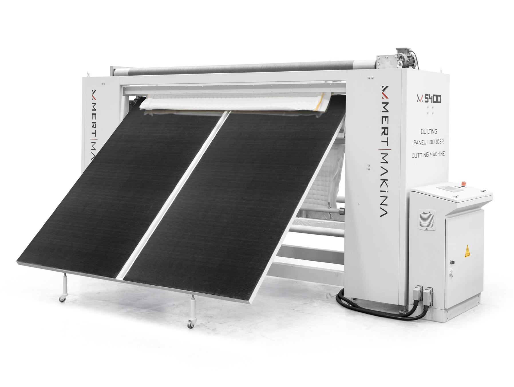 M-5400 kapitone arkasi kesim makinası, kapitone yapılan malzemenin yatak hazırlaması için panel kesim ve bordür kesimini yapmaktadır. M-5400 kapitone arkası kesim makinası özel dizaynı ve sürücü kontrolü sayesinde milimetrik kesim yaparken, üzerindeki 12 adet kesim bıçağı ile de yatak yan bordürü düzgün şekilde dilme yapabilmekte ve bu bordür kesimi üzerindeki sarım aparatı ile makine üzerine rulo olarak sarım yapmaktadır. M-5400 bugün yüksek hız ve milimetrik hassasiyet ile bütün zincir ve kilit dikiş kapitone makineleri arkasında mükemmel uyum ile çalışmaktadır.